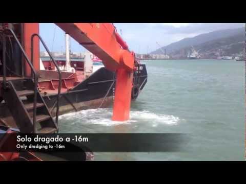 Pat M working, 16th Feb 2013.mov - Pat M - The backhoe dredger 'Pat M' working in La Guaira, Venezuela, loading the split barge Desterro, during works for the port's new Container Terminal currently ...